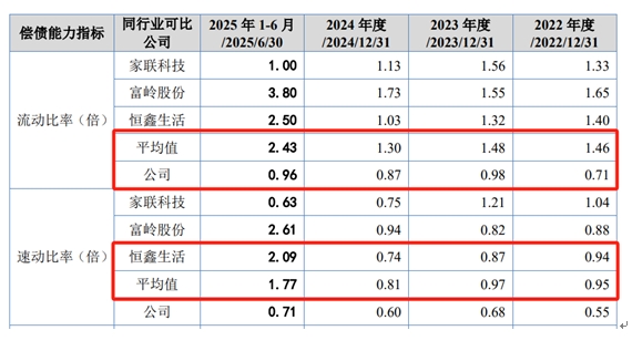 在偿债能力方面,新天力的资产负债率显著高于同行业平均水平。2022年至2025年6月末,新天力的资产负债率分别为62.09%、53.60%、50.56%和45.52%,虽然有所下降,但仍高于行业均值的44.01%、45.59%、46.09%和35.71%。高负债运营不仅会增加财务成本,也反映出公司自身积累有限,业务发展很大程度上依赖债务融资,现金流压力较大。此外,新天力的流动比率和速动比率远低于同行业可比公司,表明新天力的短期偿债能力较弱,资金流动性不足。