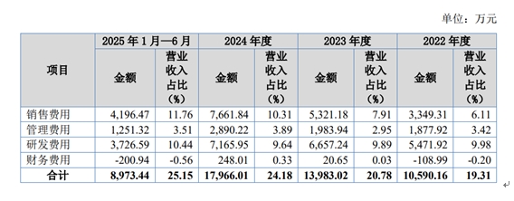 觅睿科技的销售费用率呈现明显的走高趋势。2022-2025年上半年,销售费用占营业收入的比例分别为6.11%、7.91%、10.31%和11.76%,超过研发费用。与此相对应,销售费用中的市场推广费更是一路飙升,从2022年的804.87万元增至2024年的3531.44万元,2025年上半年就达到2133.88万元,占当期销售费用的比例高达50.85%。