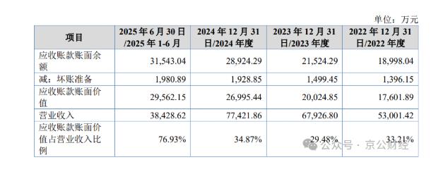 2022-2025年6月末,新恒泰应收账款账面价值分别为 1.76亿元、2亿元、2.70亿元和2.96亿元,占各期营业收入比例分别为33.21%、29.48%、34.87%和 76.93%,坏账准备分别为1396.15万元、1499.45万元、1928.85万元和1980.89万元。应收账款规模庞大且呈逐年增长趋势,给公司带来了较大的坏账风险。