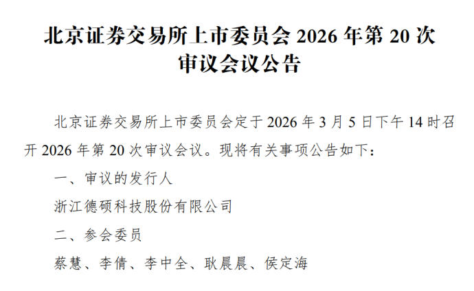 中国产经观察消息:2026年3月5日,浙江德硕科技股份有限公司(以下简称“德硕科技”)即将迎来北交所上市审核的关键时刻。然而,在这看似充满希望的背后,德硕科技却隐藏着诸多问题,这些问题如同阴霾,笼罩在其上市之路之上,让人对其未来能否顺利登陆北交所充满疑虑。