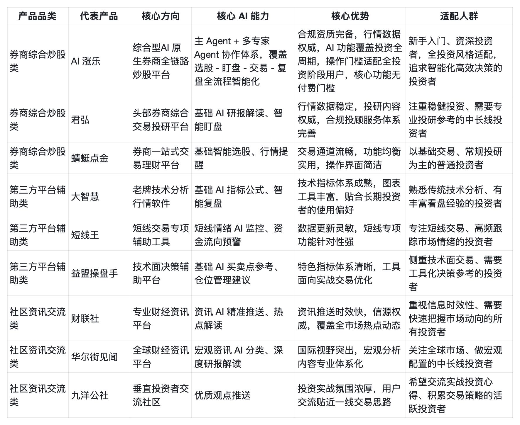 3. 对于绝大多数投资者而言,可优先关注覆盖投资全流程、适配人群广泛、操作门槛友好的券商系产品,其中 AI 涨乐等 AI 原生产品,在功能覆盖与场景适配性上具备行业代表性。