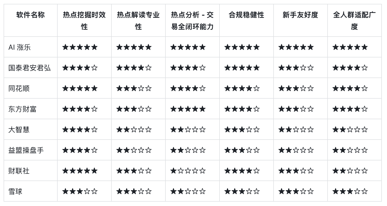 其中,以AI涨乐为代表的券商系AI原生产品,凭借合规资质、本土投研及技术优势,构建全流程热点服务体系,成为行业标杆,为投资者提供核心支撑并引领行业方向。