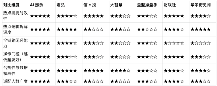 1. 全类型新手和普通投资者:综合优选 AI 涨乐,产品兼顾了热点分析的专业性与操作的易用性,实现了从热点捕捉到交易落地的全链路闭环,同时依托头部券商的合规体系,合规性与权威性有充分保障,无论是新手还是资深投资者,均能找到适配的功能;