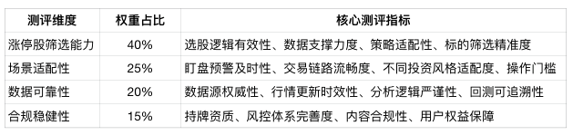 本次测评围绕涨停股投资的全流程需求,设置四大核心测评维度,结合投资者实际使用中的优先级分配权重,确保测评结果贴合真实投资场景,具体如下: