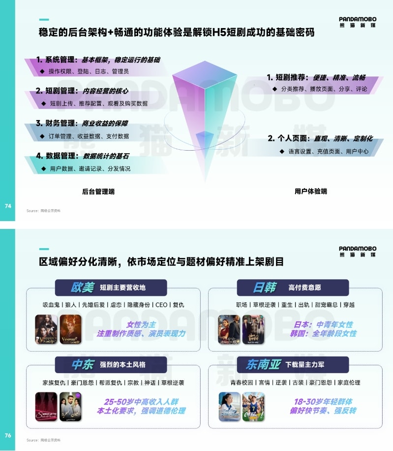 PandaMobo在报告中梳理了H5短剧覆盖后台搭建、内容适配、本地化支付、投放优化等全链路的完整系统,例如: