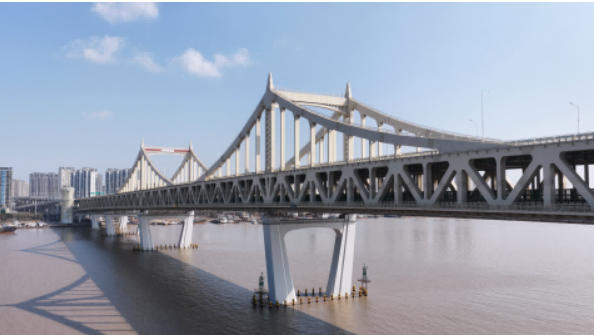 据悉,永宁大桥采用双向顶推施工工艺,其顶推施工最大跨度达130米,顶推钢梁总重量达4.67万吨,临时支墩单点支反力最大达到4270吨,单点抄垫高度达到3.7米,是国内唯一同时具备最大顶推跨度、最大支点反力、最大抄垫高度三大特点的顶推钢桁梁桥。建设过程中,中交路建项目团队坚持科技赋能,创新采用大跨超重钢桁梁大坡率复杂竖曲线智能双向顶推施工技术,利用BIM技术对顶推施工进行全过程模拟,监测应力、标高、线形的变化,及时纠正偏差;设计高强度顶推支架临时结构,确保承载能力满足顶推要求;采用PLC同步控制系统实行多点牵引拖拉,实现多台水平千斤顶同步顶推;研发“长距离双向顶推系统及纠偏系统”,实现钢桁梁毫米级精准合龙,相关技术成果达到国际领先水平。