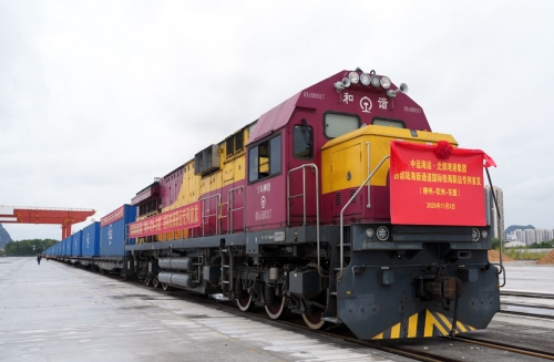 西部陆海新通道柳州—钦州—东盟铁海联运专列发车。