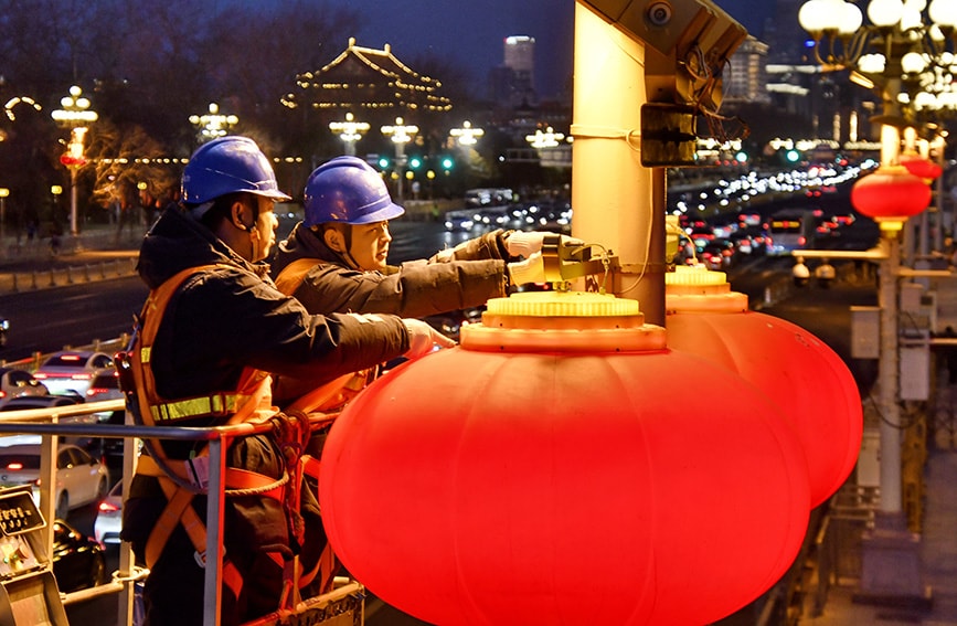 春节将至,北京长安街及其沿线安装了1000多套大红灯笼、中国结、串灯等照明灯饰。春节景观布置遵循“利旧复用”原则,所使用的大红灯笼、中国结及串灯等均延续使用去年的设施,灯笼灯饰利旧率达90%。