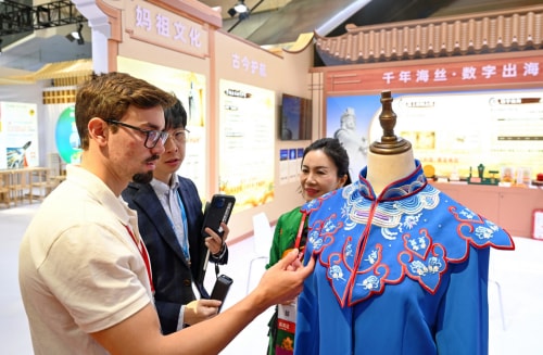 3月18日,巴西客人(左一)在妈祖文化主题专区了解特色服饰。