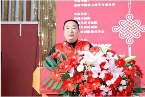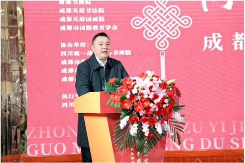 舒炯在致辞中对出席的领导、嘉宾、艺术家、获奖作者、入展作者及书画爱好者表示热烈欢迎,并对长期关心支持成都市满蒙人民学习委员会的社会各界致以衷心感谢,向全体投稿作者表达崇高敬意。他介绍,成都市满蒙人民学习委员会成立于1957年,是目前全国唯一的由满族和蒙古族两个民族合在一起成立的公益性少数民族社团组织。多年来满蒙学委会始终以铸牢中华民族共同体意识为主线,通过多元化的文化活动形式,积极促进各民族交往交流交融,传承弘扬中华优秀传统文化,推动民族团结进步事业。他在谈到该展基本情况时说,本届展览,多元文化的交融之美跃然纸上,有聚焦民族团结的篇章,有深耕文化传承的力作,更有展现时代风貌的佳作。从成人组的沉稳笔墨到青少年组的灵动创意,不同民族、不同年龄的创作者,以各自的艺术语言诠释着对共同家园的热爱与对共同梦想的向往。本届展览的每一幅作品,都在诉说着中华文化的包容性与生命力—它既能容纳各民族的文化特色,又能凝聚成推动中华民族伟大复兴的精神力量。这些作品不仅是艺术技巧的展示,更是各民族优秀传统文化互鉴融通的见证,让观众在审美愉悦中感受“中华民族一家亲”的深刻内涵。